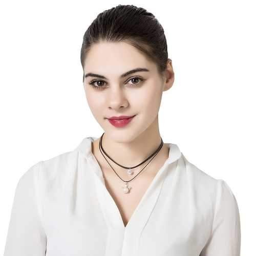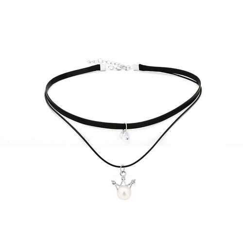 Women’s Punk Necklace Two Layers Crown Shape Pearl Pendant Sparkling Rhinestone Black Choker